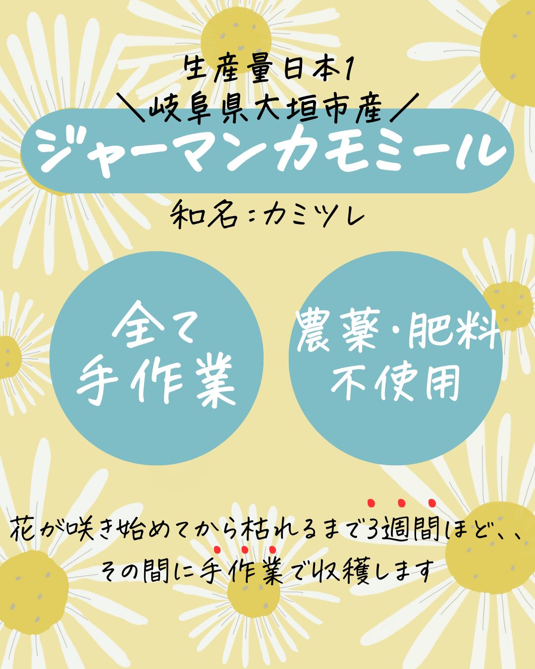 生産量全国1位の岐阜県大垣市上石津で農薬・肥料に頼らず、自然の恵みだけで育てられた完全自然栽培のカモミールティー。
